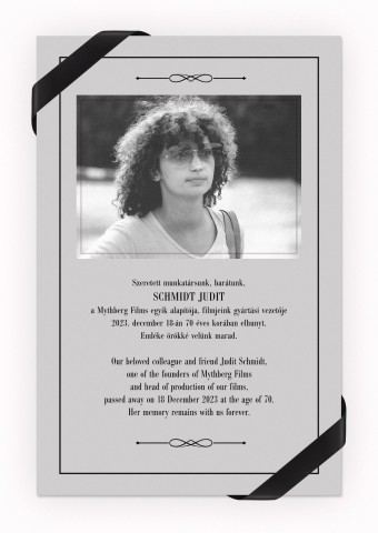 Szeretett munkatársunk, barátunk, SCHMIDT JUDIT a Mythberg Films egyik alapítója, filmjeink gyártási vezetője 2023. december 18-án 70 éves korában elhunyt. Emléke örökké velünk marad.